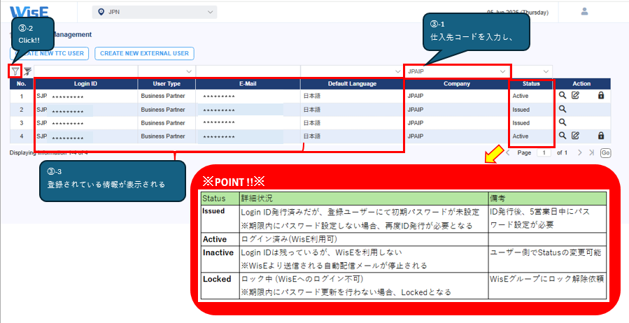 WisE上で登録Statusを確認することが可能です。